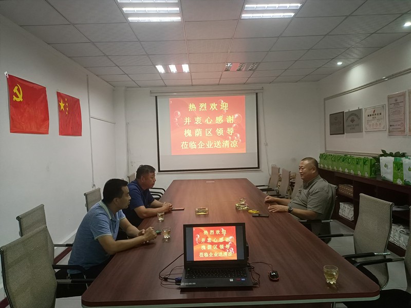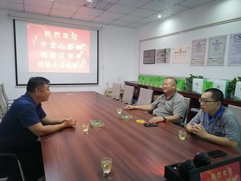 8月19日上午,受槐蔭區領導委托,槐蔭區工信局副局長惠健一行蒞臨公司進行夏季送清涼活動。公司董事長徐福厚、董事會秘書兼辦公室主任王德華熱情接待了惠健副局長一行。
